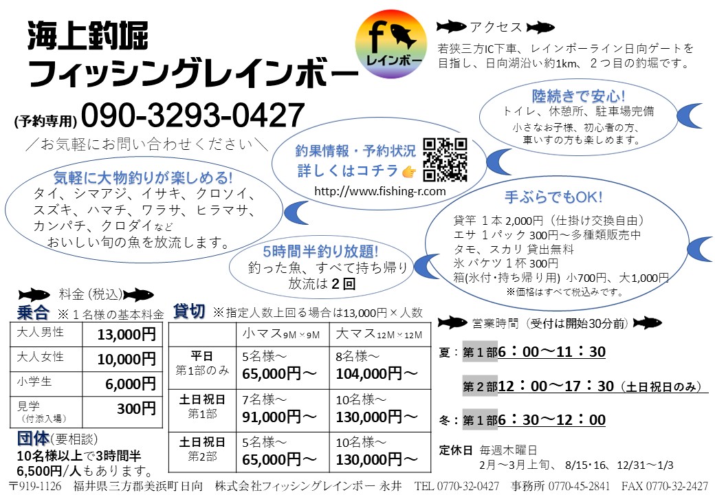 | 楽しい時間を過ごしていただくためにレインボーからのお願いです。 | レインボーでの釣行について、動画と解説でチェック👆 | 海上釣堀で使いやすい基本的なタックルについてチェック👆 |