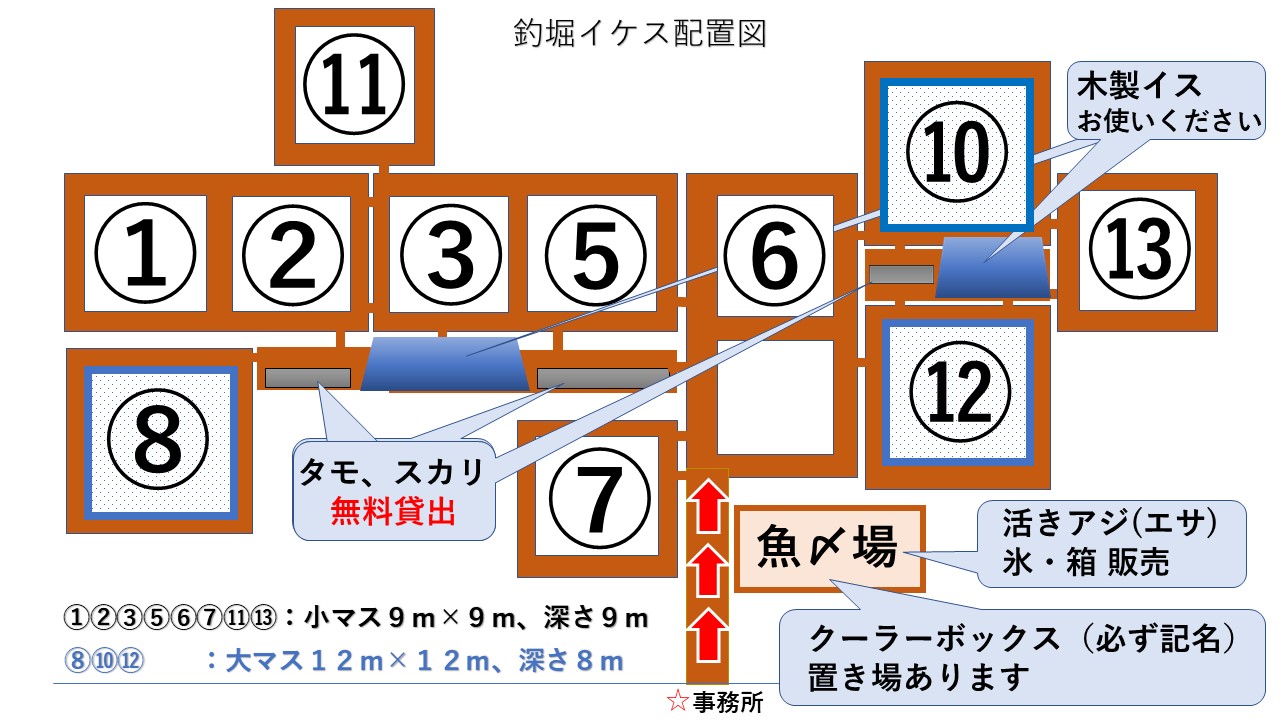 - 乗合コースは、基本的に、大マス(12×12m、定員12名)での釣行となります。予約状況により、小マス(9×9m、定員8名)での釣行となる場合があります。