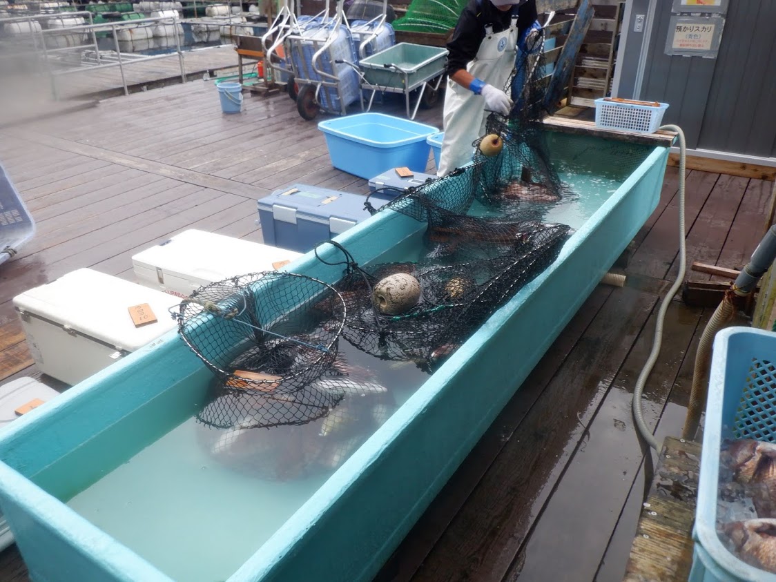 魚の入ったスカリを、魚〆場の水槽にそのままつけて下さい。その手前にクーラーボックスを置いて下さい。